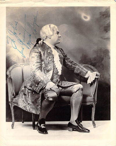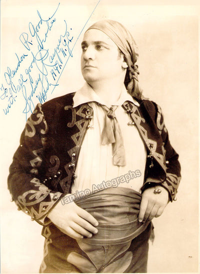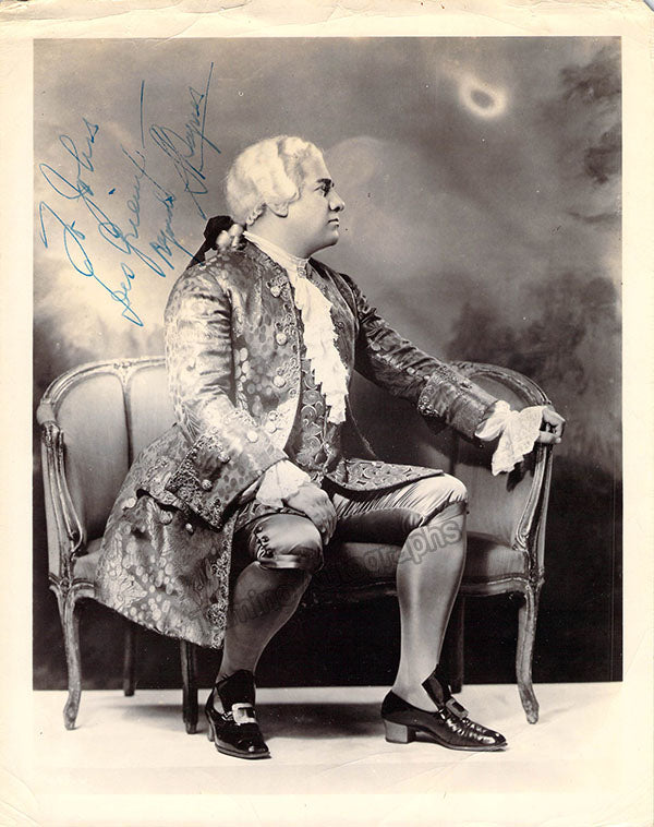 Signed photograph, shown in role (possibly Des Grieux in Manon), inscribed. Size is 8 x 10 inches, several creases and bends, otherwise in good condition.