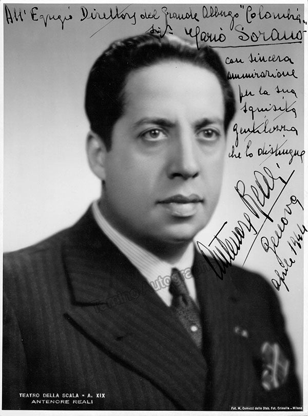 Italian baritone (1897-1960), signed photograph, shown as himself. Inscribed with sentiment and dated in Genoa in 1944. Photo by M. Camuzzi, La Scala, Milan. Size is 7 x 9.25 inches, spots on verso, otherwise in excellent condition.