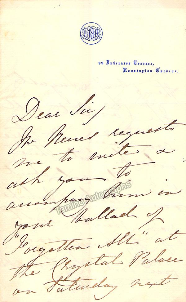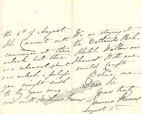 English soprano and esteemed voice teacher, wife of John Sims Reeves, the foremost English operatic, oratorio and ballad tenor vocalist of the mid-Victorian era. Autograph letter signed, on personal stationary, 3 pages, 4.5 x 7 inches, in excellent condition.