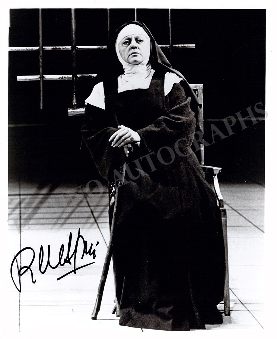 Gorgeous black-and-white photograph signed by her, shown in costume as Madame Lidoine (Mother Marie) in Poulenc's opera Dialogues des Carmelites -a role she created for the premiere of the original French version in Paris on June 21st, 1957, conducted by Pierre Dervaux.  Size is 8 x 9.9 inches, in excellent condition.