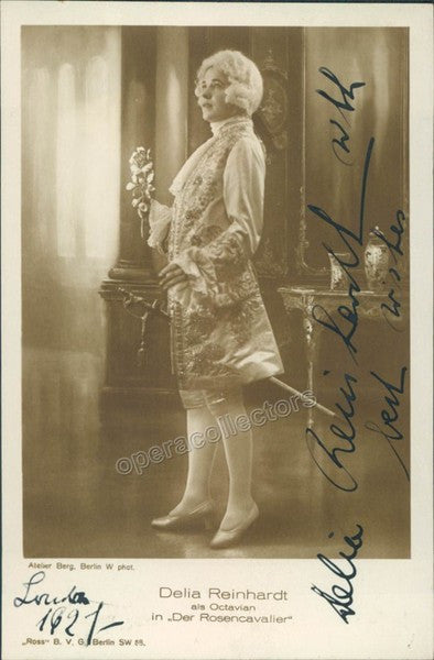 Signed photo postcard of the German soprano/mezzo- (1892-1974), shown as Octavian in Der Rosenkavalier, dated in London in 1927. Size is 3.5 x 5.25 inches, in excellent condition