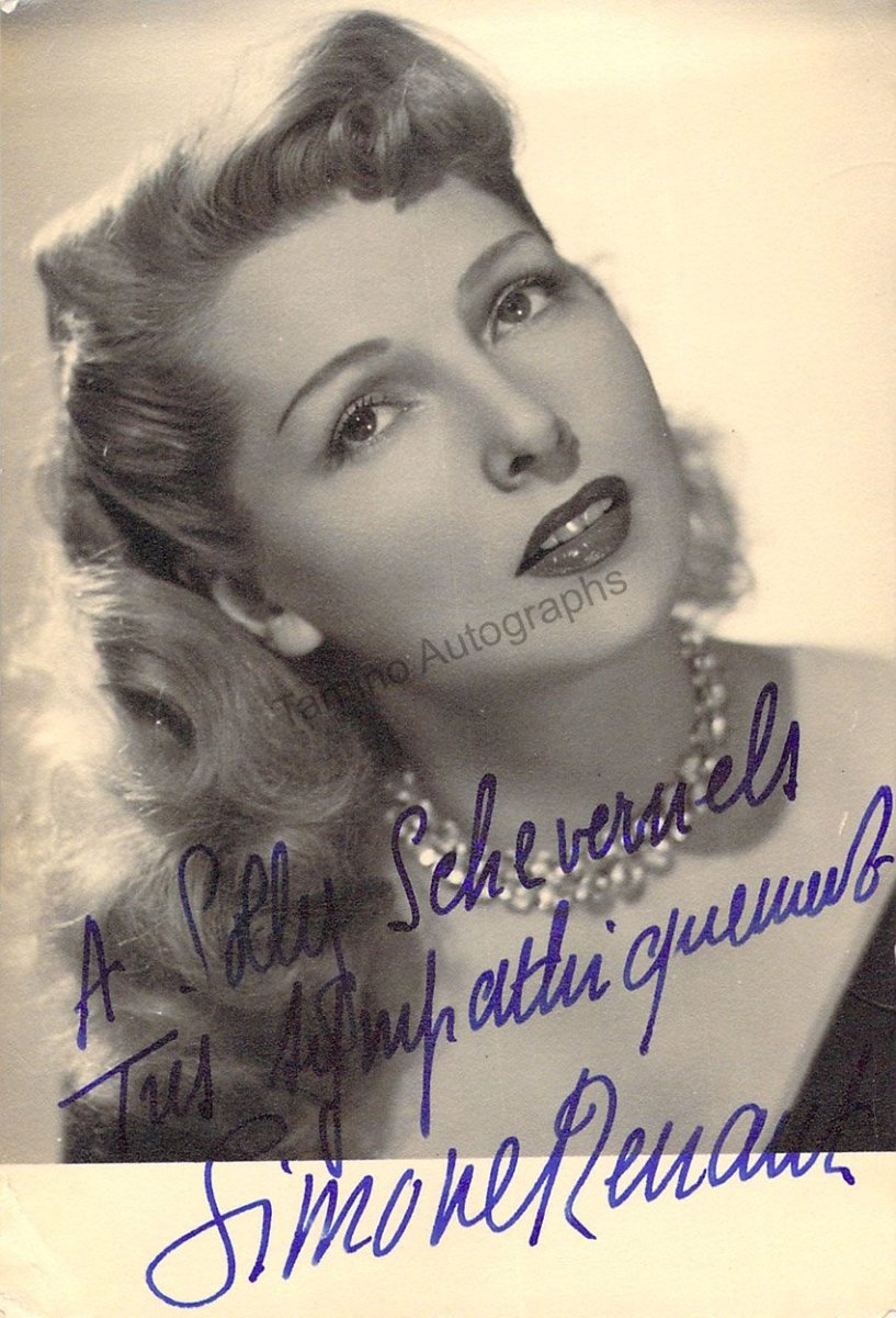 French film actress (1911-2004), active between 1934-1983.  Beautiful photograph signed and inscribed by her with a short sentiment, shown young.  Photograph is ink-stamped on verso by photographer Sam Levin, Paris.  Size is 3.75 x 5.5 inches, in excellent condition.