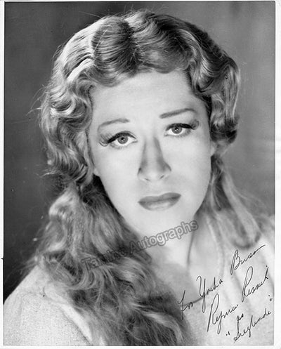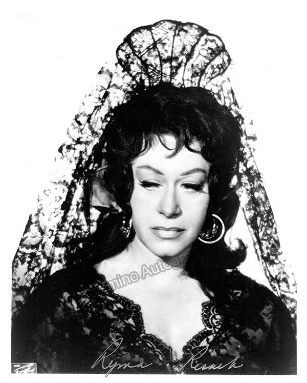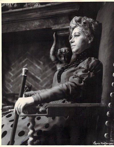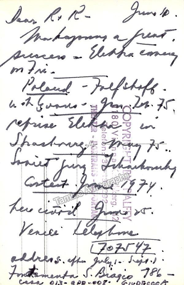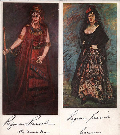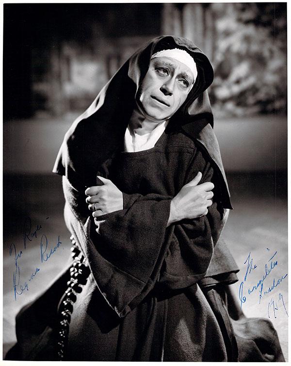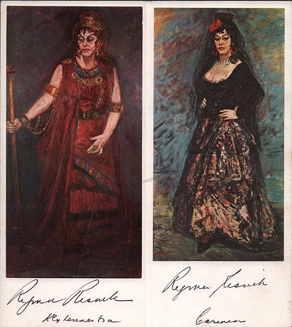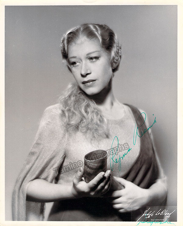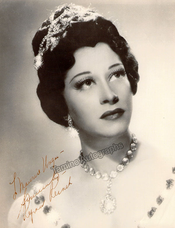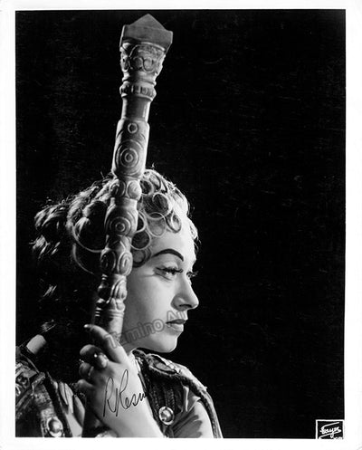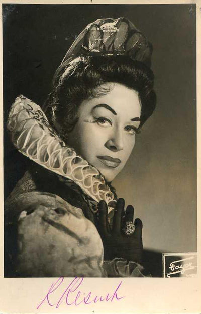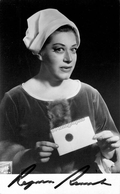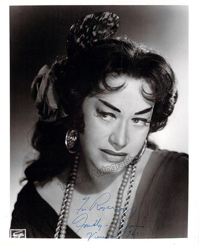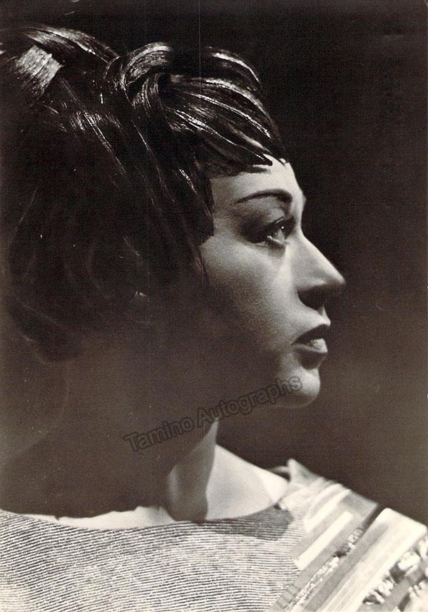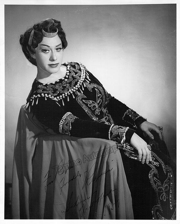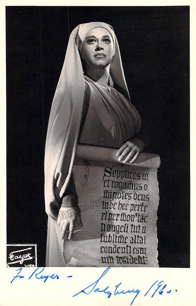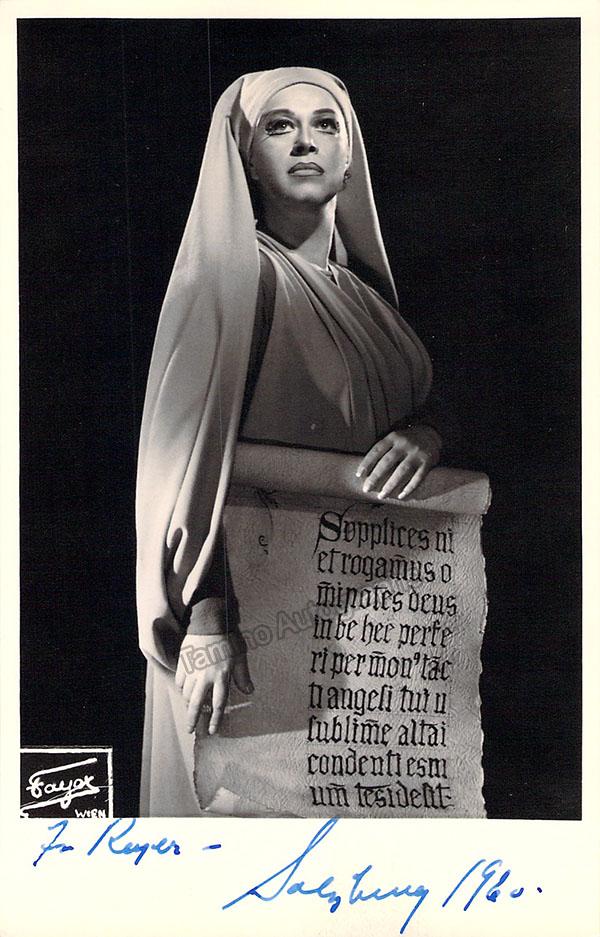 Nice black-and-white photograph signed and inscribed by her with a short sentiment dated in Salzburg, 1960, shown probably as Elisabetta in Verdi's Don Carlo; ink-stamped on verso by photographer Fayer (Vienna). Size is 3.5 x 5.5 inches, mounting traces on verso, in very good condition.