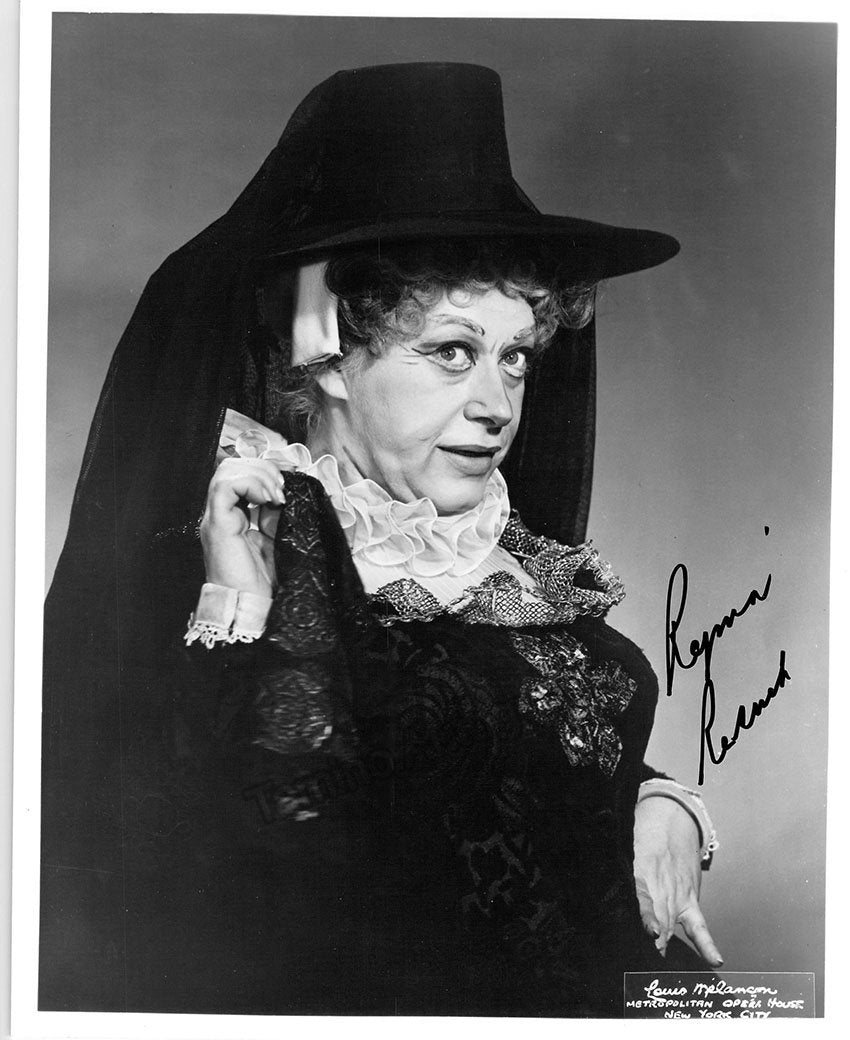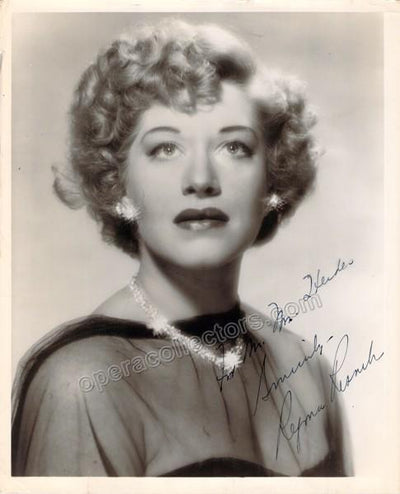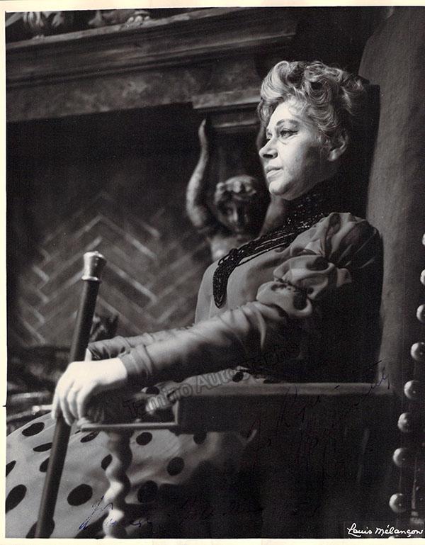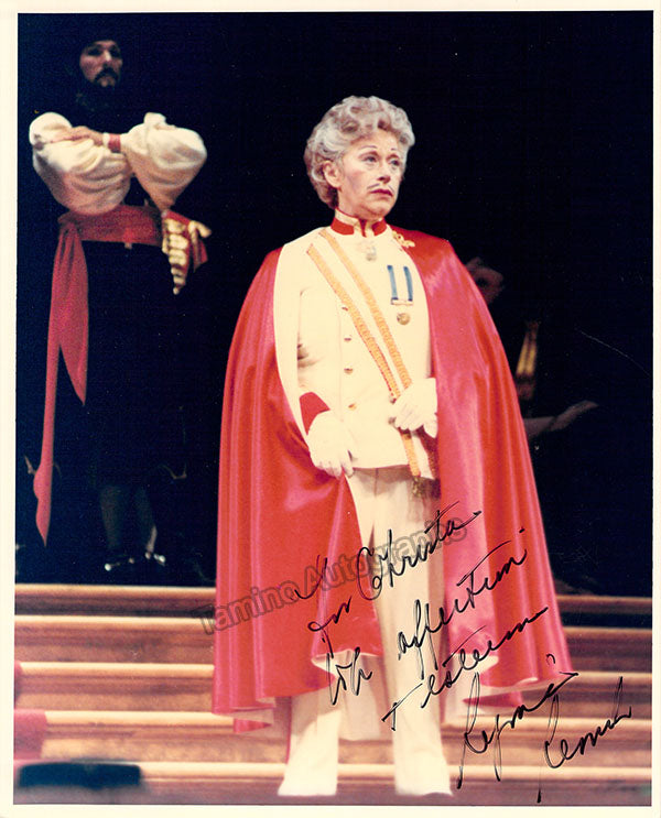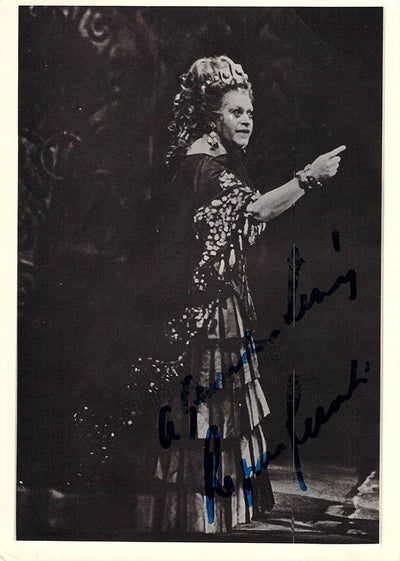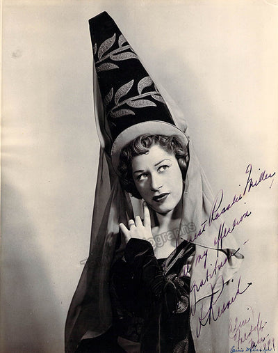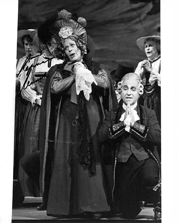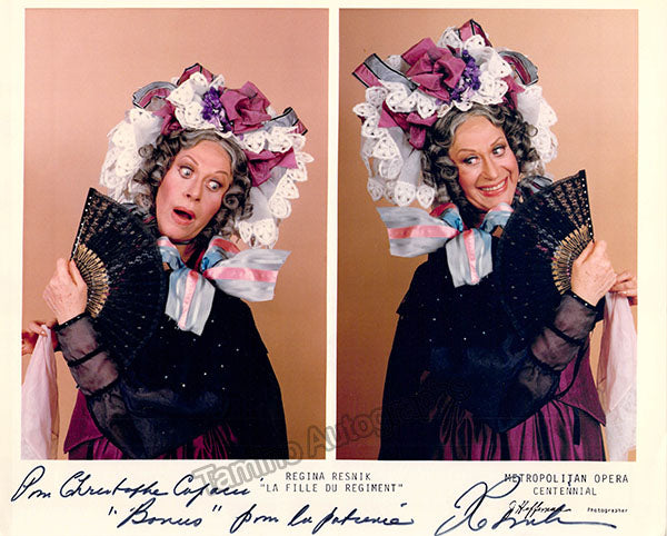 Signed photograph, shown in 2 photos as the Marquise of Berkenfield in Donizetti's Fille du Regiment, inscribed. Photo by James Heffernan, Metropolitan Opera, New York. Size is 8 x 10 inches, slight creases and bends, otherwise in excellent condition.