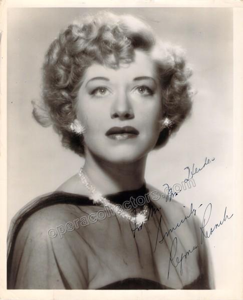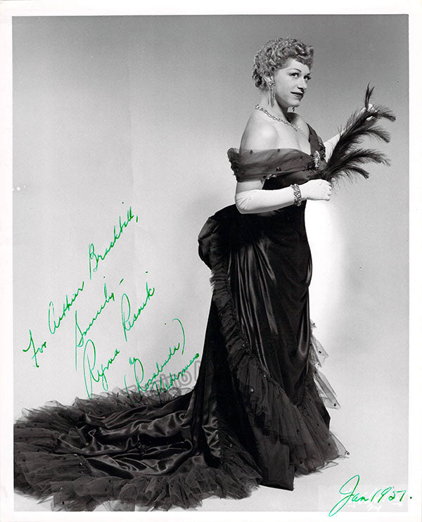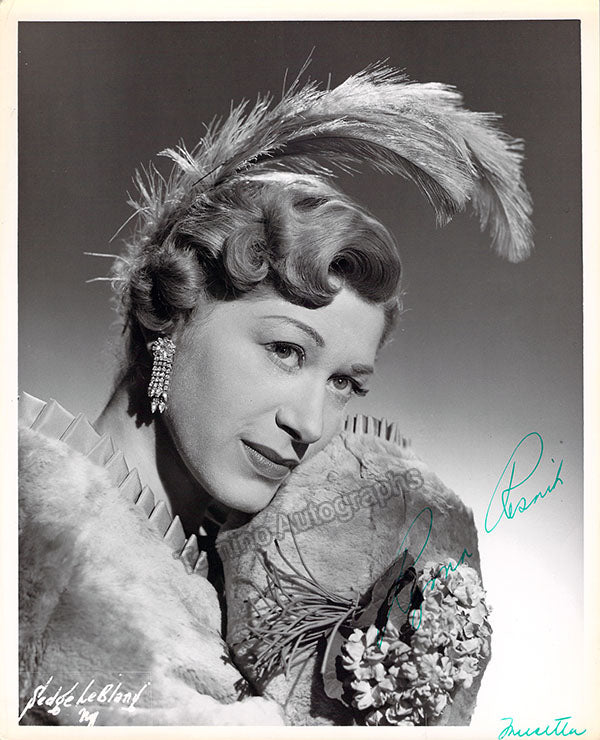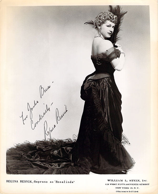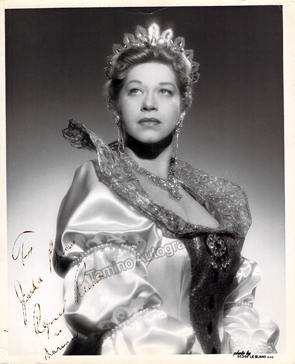 Signed photograph, shown as Rosalinda in Johan Strauss's Die Fledermaus, inscribed, dated in 1957. Stamped on verso by photographer Sedge LeBlang, Metropolitan Opera, New York. Size is 8 x 10 inches, slight creases and bends, otherwise in excellent condition.