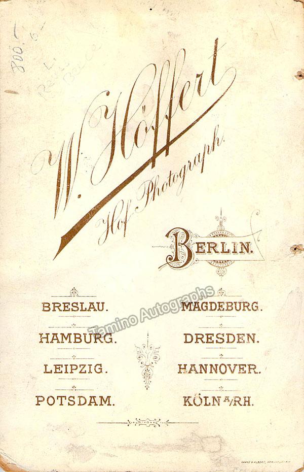 Austrian soprano (1862-1945), starred in the world premiers of the first complete performance of Berlioz's Les Troyen in 1890.  Signed cabinet photo, shown as Fricka in Wagner's Der Ring des Nibelungen, inscribed and dated in 1904. Photo by W. Hoffert, Berlin. 4.25 x 5.75 inch photo mounted onto cabinet, total item is 4.25 x 6.5 inchesin excellent condition.