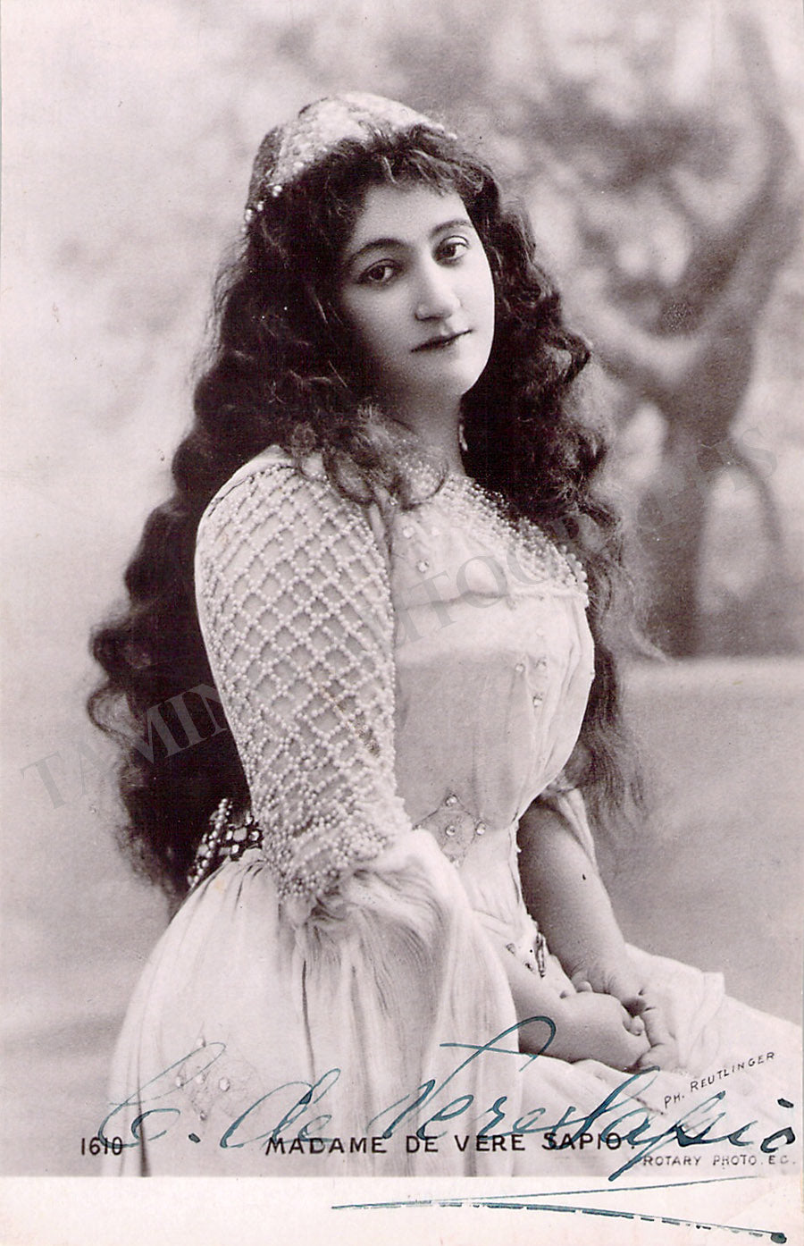 Beautiful black-and-white photograph signed by her, dated in Pittsburg, May 1st, no year.  Size is 4 x 5.75 inches, jagged edges, mounting traces on verso, in excellent condition.