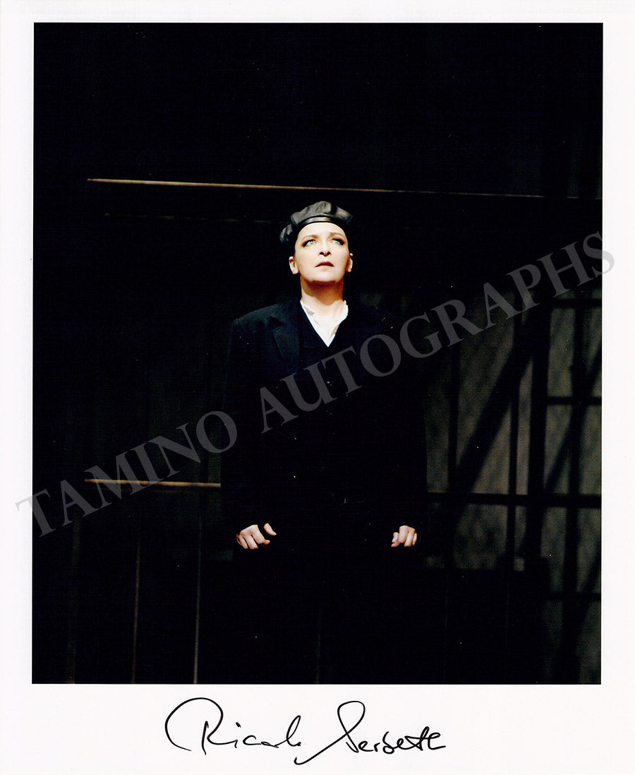 Nice color photograph signed by her, shown in performance, probably in Strauss' opera Elektra. Size is 7.9 x 9.75 inches, in excellent condition.
