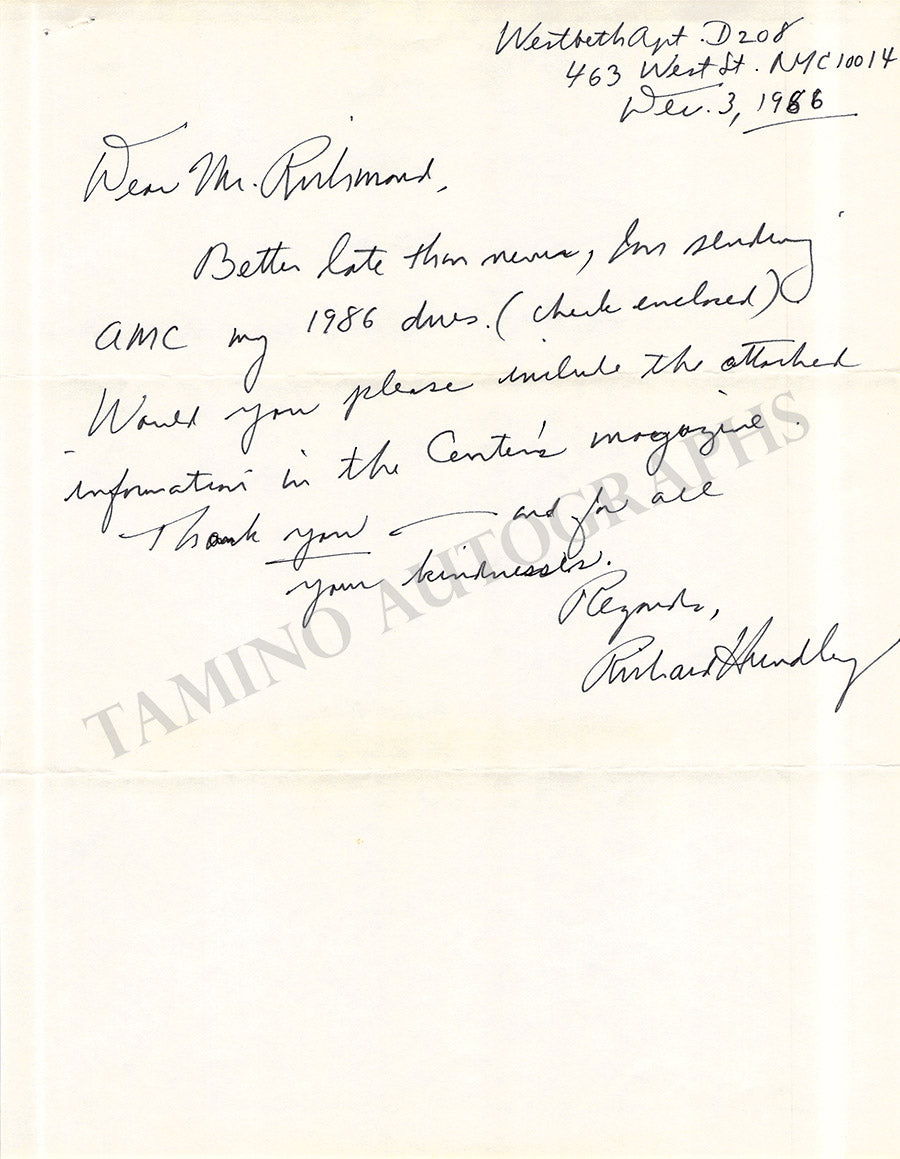 Autograph letter signed by Hundley dated December 1986 and addressed to his friend LeRoy Richmond. Size is 8.5 x 11 inches, 1 page, folds, in very good condition.