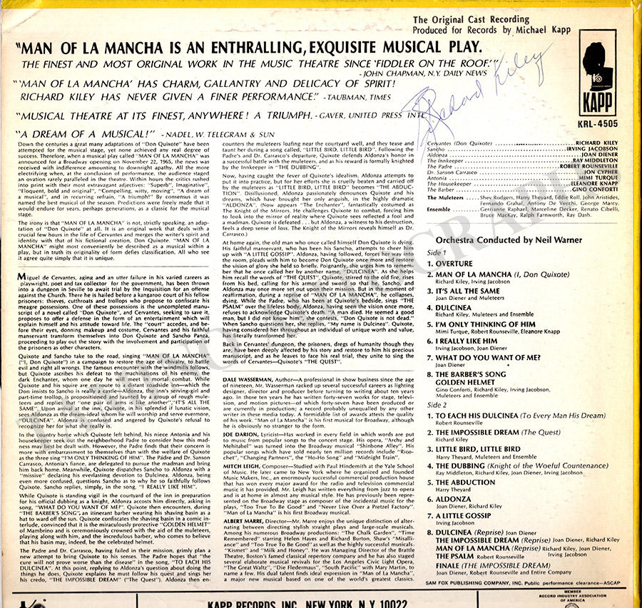 Kiley, Richard - Signed LP Record "Man of La Mancha" Kiley, Richard - Signed LP Record "Man of La Mancha"