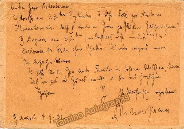 German opera composer (1864-1949), one of the greatest of the 20th century. Autograph note signed, handwritten on a postcard, in German (sold untranslated), dated in Garmish in 1931. Size is 5.5 x 4.1 inches, some wear on borders, otherwise in good condition. ALSO INCLUDED is an unsigned photo of the composer. Size is 4.9 x 6.5 inches, perfect item to frame with the autograph note.