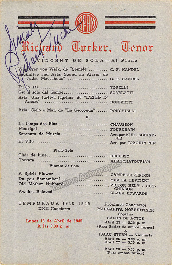 Program for a recital of the celebrated American tenor at SPAM -Sociedad ProArte Musical, Havana, Cuba, on April 18th, 1949, signed by him.  Size is 5.4 x 8.6 inches, 1 sheet printed on both sides, in excellent condition.