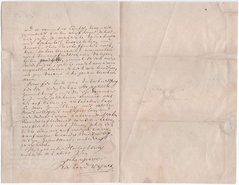 Beautiful handwritten and signed letter by the great German composer (1813-1883). In the middle of a difficult period of his life, Wagner writes about his troubled financial and sentimental situation, mentions the Bulows (Cosima Liszt, Hans von Bulow´s wife would eventually divorce von Bulow and marry Wagner). Full Translation available and can be provided on request. Size is 5.25 inches, on 1 page, written on both sides. In very good condition, with a light diagonal crease and scattered light creasing, uniform toning, scattered light soiling