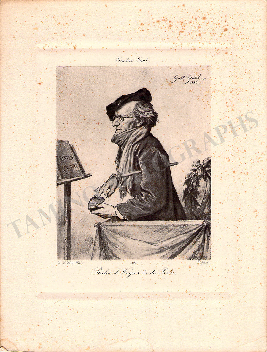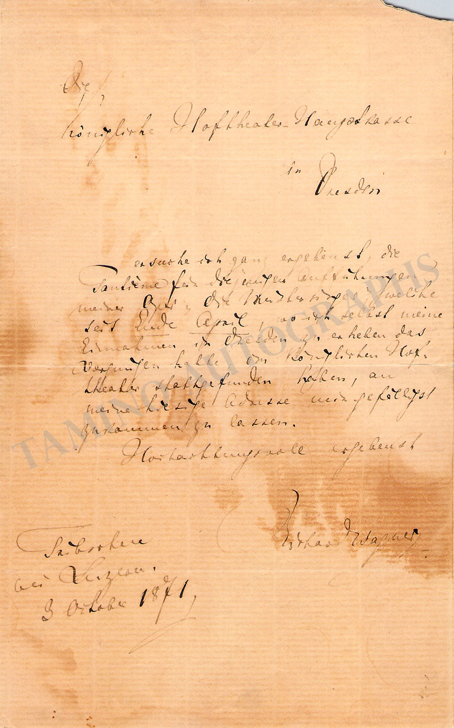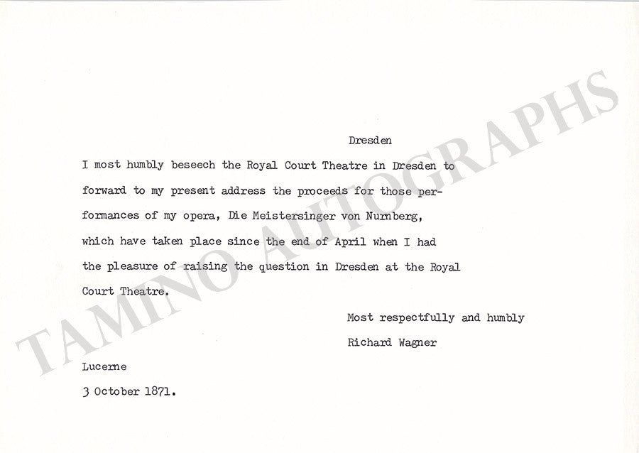 Autograph letter in German signed by him where he mentions his opera Die Meistersinger dated on October 3, 1871. Size is 5.25 x 8.5 inches, 1 written page, some stains, central fold, small loss of paper over the upper-right corner, in overall very good condition.