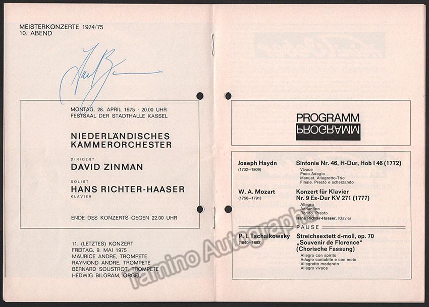 Signature on bio page next to full page portrait 24 x 14.5 cm. Co-signed on program page by DAVID ZINMAN. Program Dutch Chamber Orchestra Kassel 28. April 1975. Excellent condition, storage holes not affecting signature - slightly affecting picture.