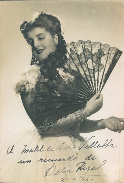 Argentinian soprano (b. 1921), sang at the Met Opera for 7 seasons, 12 at Teatro Colón in Buenos Aires, Argentina - also La Scala, etc. Signed photo, shown in role (probably as Violetta in La Traviata), 4 x 5.5 inches, inscribed, dated in 1946. Stamped on verso by photographer Schonfeld, Buenos Aires.