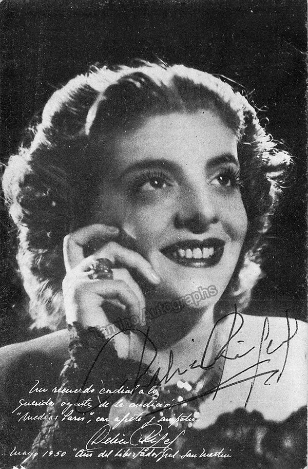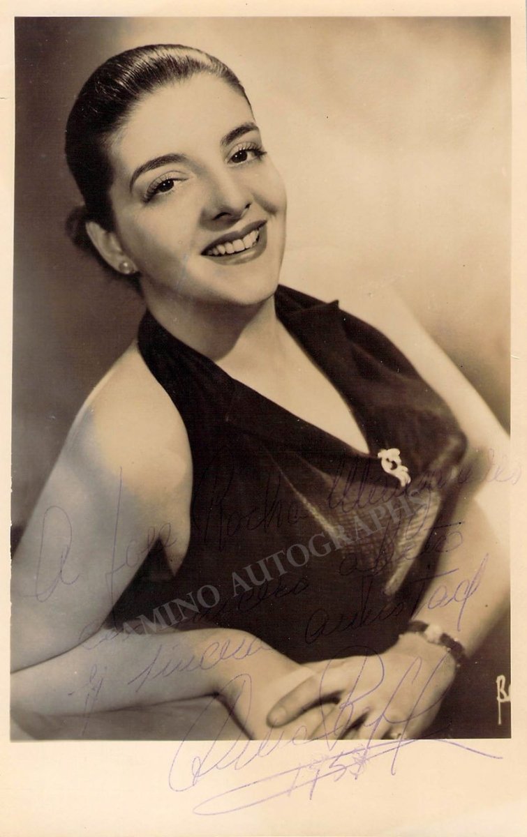 Signed photo, shown as herself in a concert setting, inscribed. Stamped on verso by photographer Castello, Buenos Aires. Size is 4.75 x 7 inches, in excellent condition.