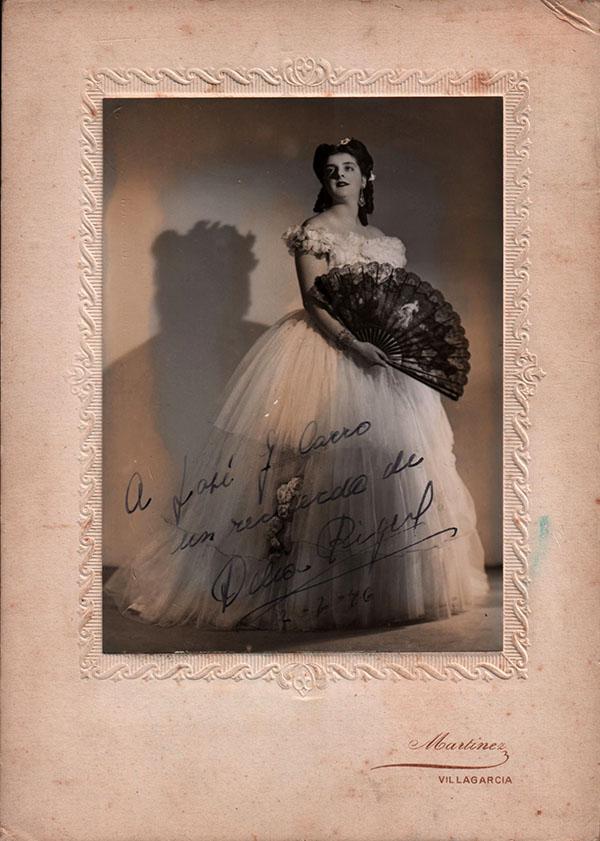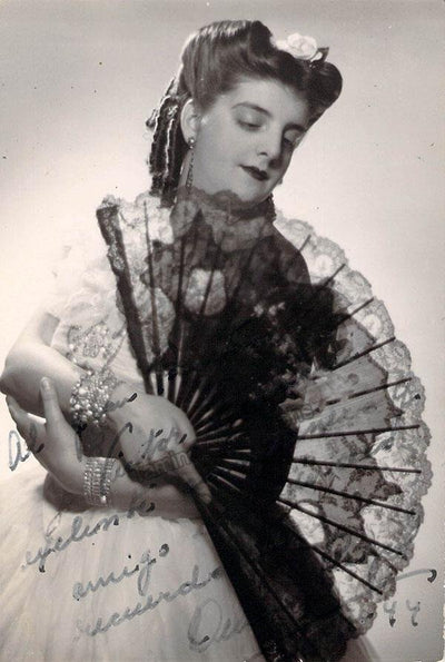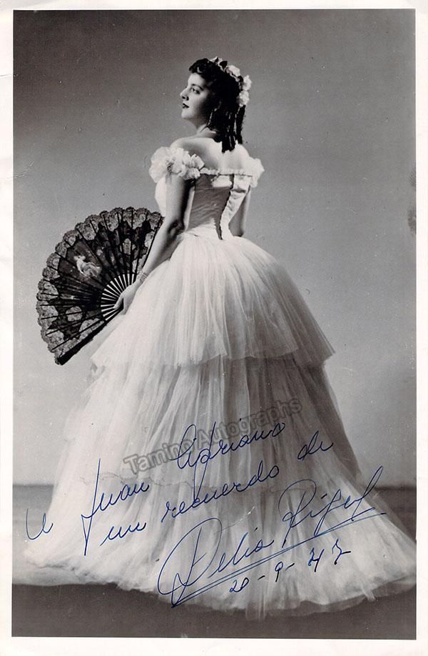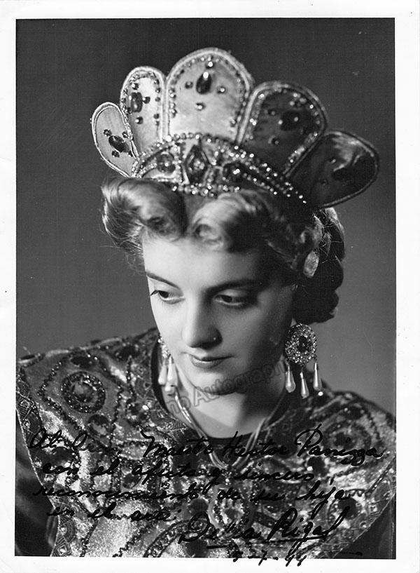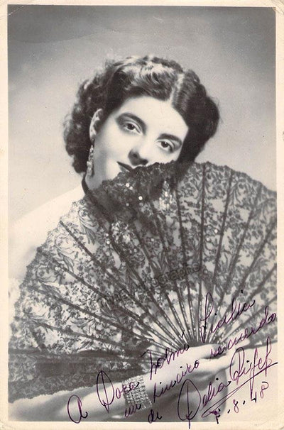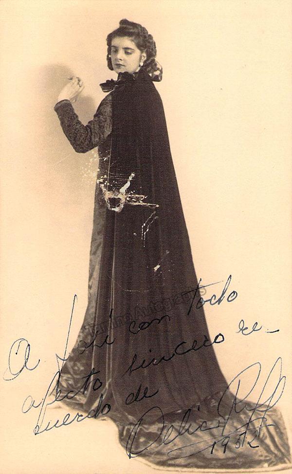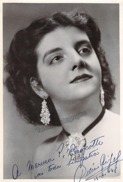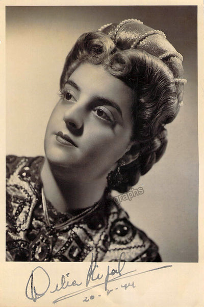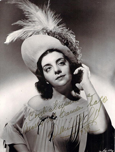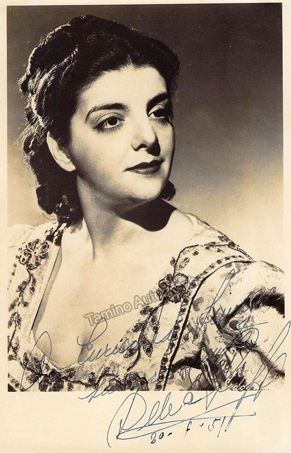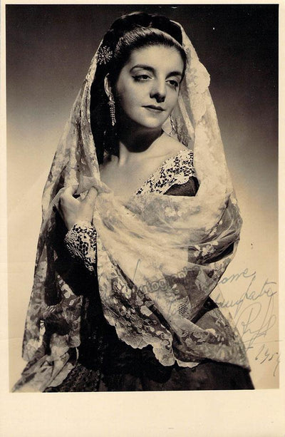 Signed photo, shown as Violetta in Verdi's Traviata, inscribed and dated in 1948. Stamped on verso by photographer Schonfeld, Buenos Aires. Size is 4 x 6 inches, in excellent condition.