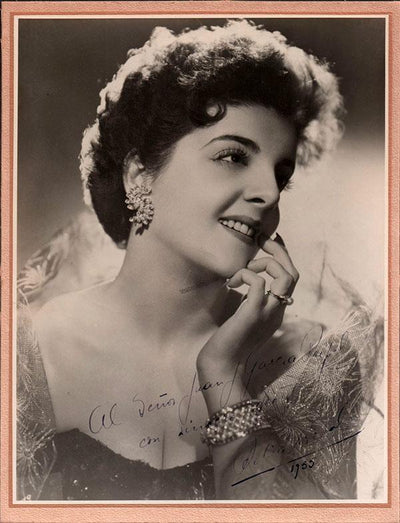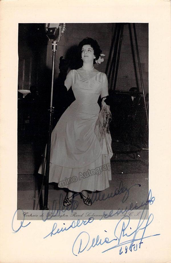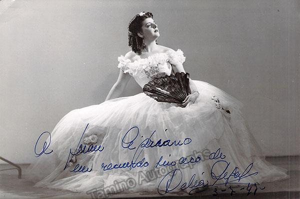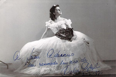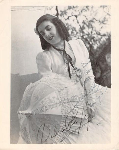 Signed photo, shown as Violetta in Verdi's Traviata, inscribed and dated in 1947. Stamped on verso by photographer Schonfeld, Buenos Aires. Size is 3.75 x 5.75 inches, in excellent condition.