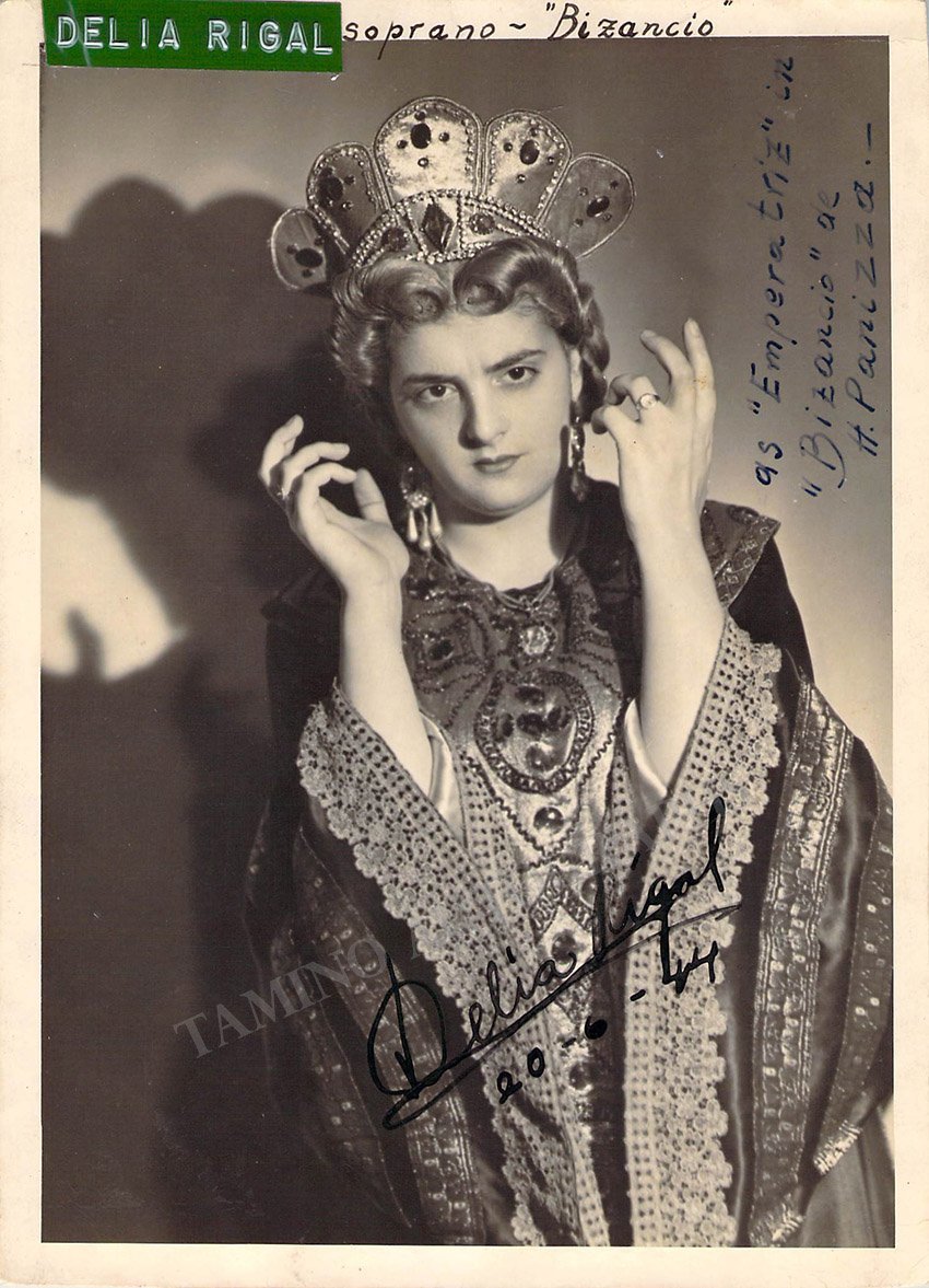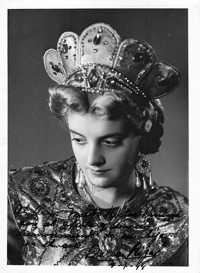 Signed photo, shown in role in Argentinian composer and conductor Ettore Panizza's opera Bizancio, dated in 1944. Size is 5 x 7 inches, some mounting traces on verso, otherwise in very good condition.