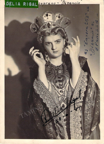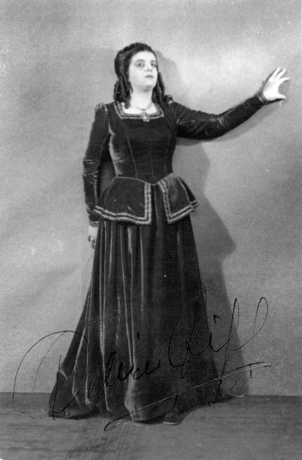 Signed photo, shown in role (possibly Leonora in Verdi's Forza del Destino), dated in 1952. Size is 2.5 x 4 inches, in excellent condition.