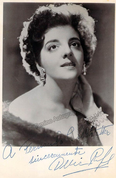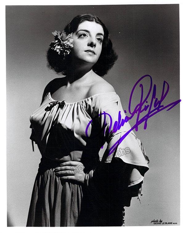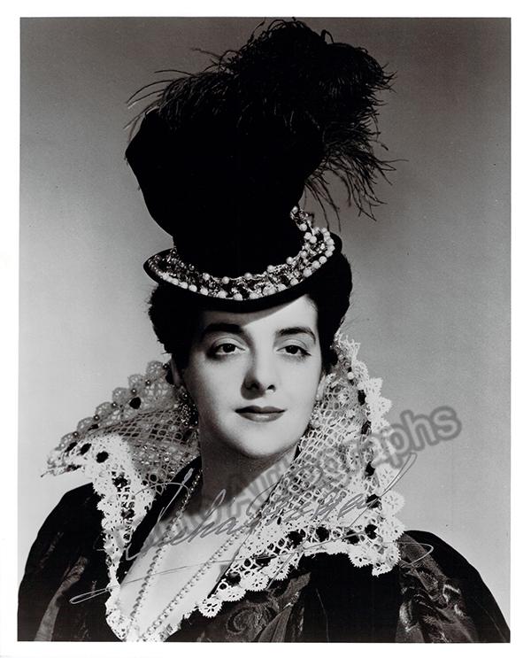 Half-tone signed photo, shown young, in role, 8 x 10 inches, inscribed. Minor folds, otherwise in excellent condition. Photo has a facsimile signature in black color, and a real one in ink in blue color. Dated in New York in 1951, a year after her debut at the Metropolitan Opera.
