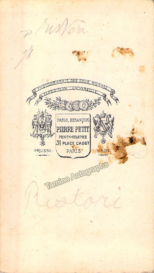 Italian actress (1822-1906), known for tragic dramas,  who was often referred to as the "Marquise". Unsigned CDV, shown in role. Photo by Pierre Petit, Paris. Size is 2.25 x 4 inches, some smudges on verso, otherwise in very good condition.
