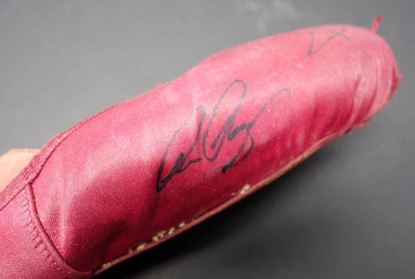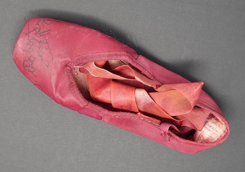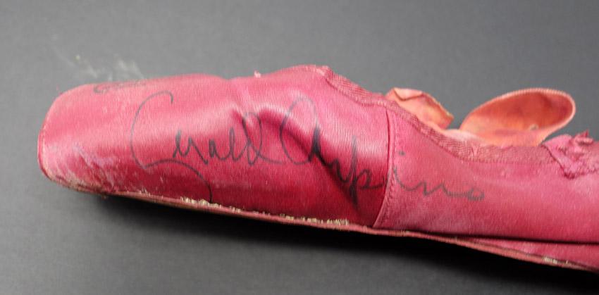 Deep burgundy ballet slipper, signed by all 3 artists, used in performance, approx. 3.5 x 9 inches, in very good condition.