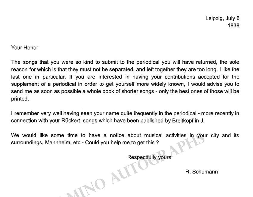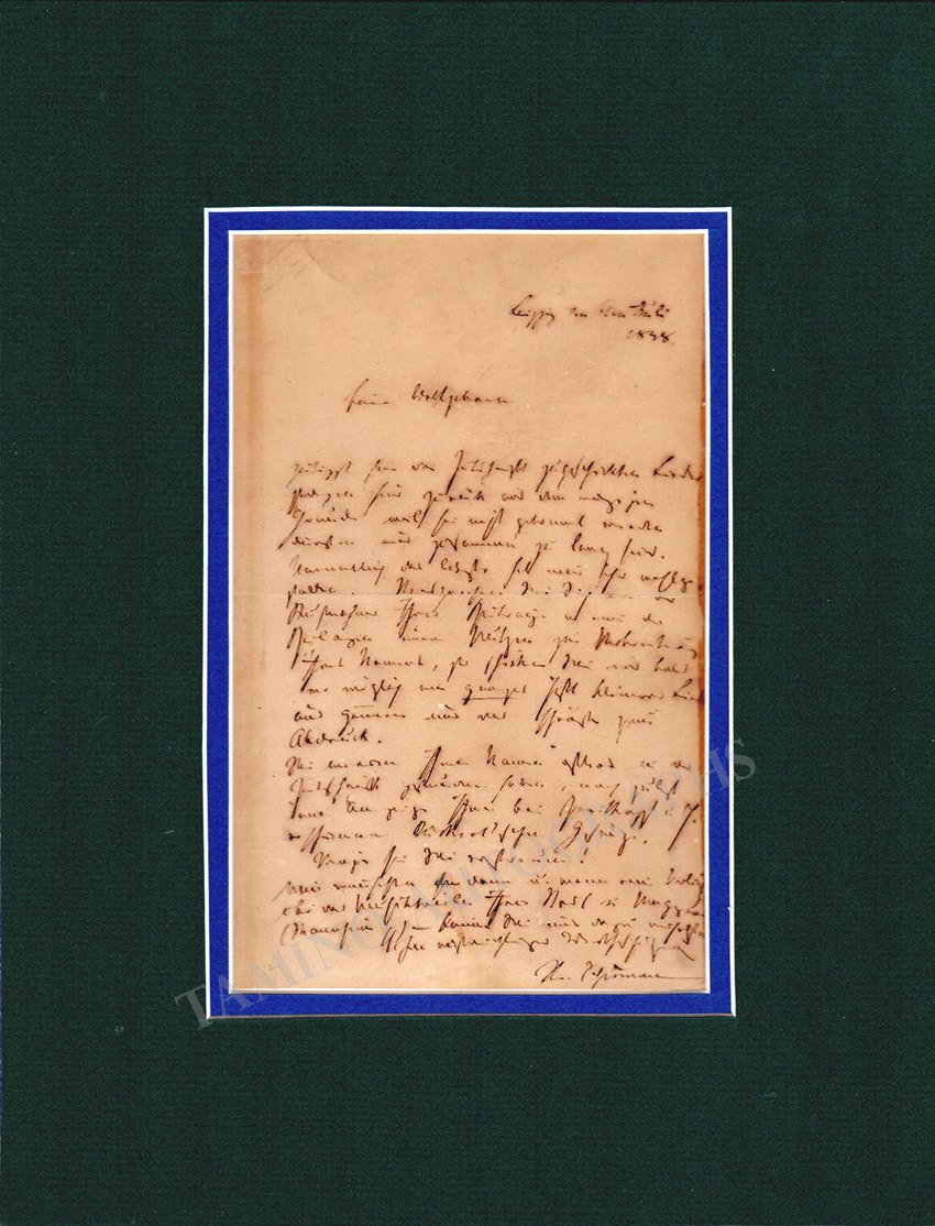 German composer (1810-1856) and critic, one of the greatest composers of the Romantic period. Autograph letter signed by him, to an unidentified composer, dated in Leipzig in 1838. One page, in German, provided with translation, about publication of a composer´s work in a magazine. Size is 5 x 8 inches (visible window size), beautifully matted to a total size of 10 x 13 inches. Overall age toning, rust on right border, but in very good condition.