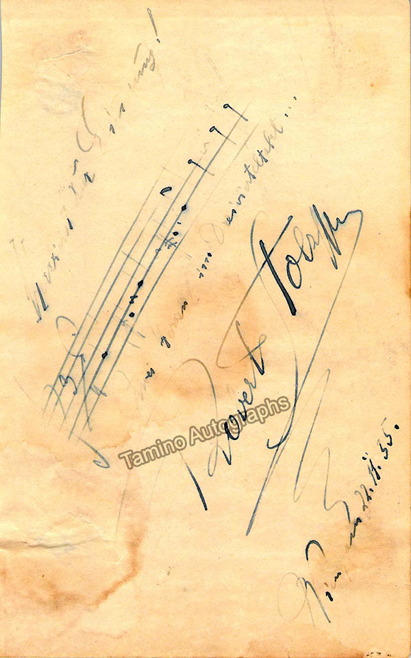 3-bar autograph music quote from one of his songs signed by him in Vienna, 1935, on an album page. Size is 4.5 x 7.25 inches, rust stains, smudges, in overall good condition.