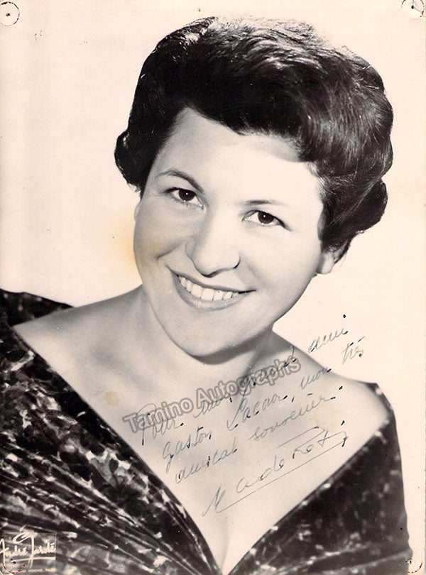French coloratura soprano (1918-1960), a TV and radio star in the 50's, known world-wide  for her ability to sing extremely-never sang, notes. Signed photograph, shown as herself, inscribed. Stamped on verso by P.I. editions, Paris. Size is 6.5 x 8.75 inchess, small bullet holes on top and bottom right corners, otherwise in very good condition. Rare!