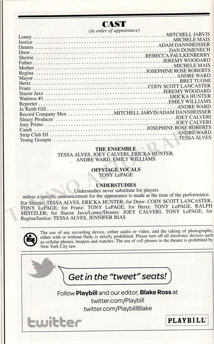 Original playbill for a Broadway performance of the jukebox musical Rock of Ages at The Helen Hayes Theatre, featuring Mitchell Jarvis, Michele Mais, Adam Dannheisser, Andre Ward, Bret Tuomi, Emily Williams, and others; signed by some members of the cast.