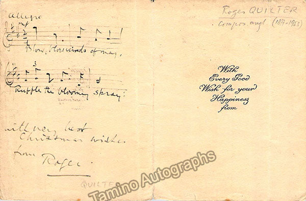 Greeting card with a 4-bar autograph music quote from an unknown piece signed by the composer as "Roger" with a short sentiment (his complete last name is written in pencil under his signature).  The card has a printed greeting on the right with a pencil marking over the upper-right corner.