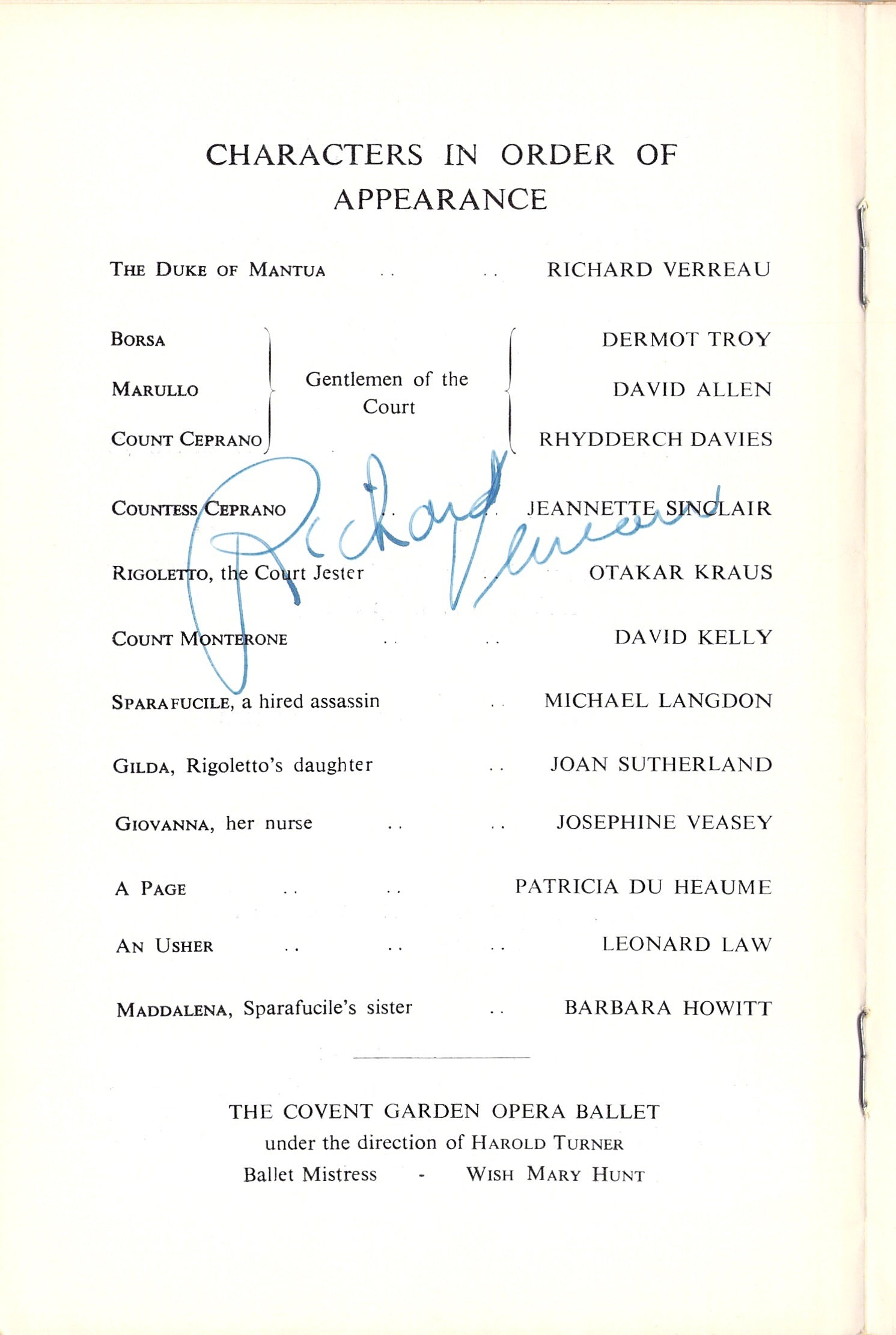Program for a performance of Verdi's Rigoletto at the Royal Opera House, Covent Garden, London, on May 8th, 1957, signed by tenor Richard Verreau on the cast page. Cast includes Joan Sutherland as Gilda and Otakar Kraus as Rigoletto. Size is 4.75 x 7.4 inches, full program with all pages and covers, in excellent condition.
