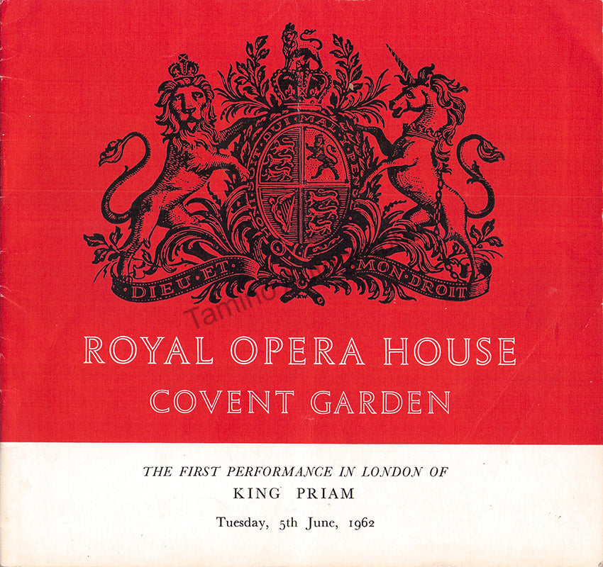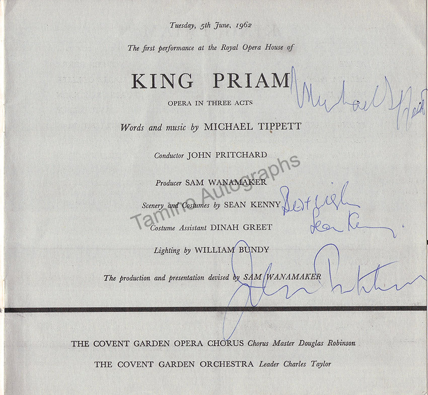 Program for a performance of Tippett's 'King Priam' on June 5th, 1962, signed by composer Michael Tippett, conductor Sir John Pritchard and costume designer Sean Kenny.