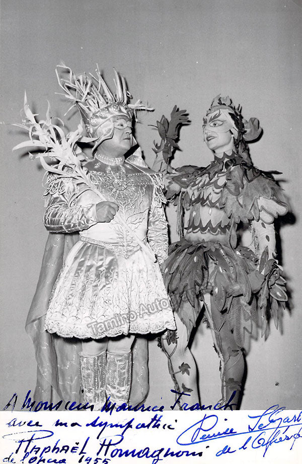 French tenor (1906-1999) and French mezzo-soprano  (1917-2011), double signed photograph, shown in roles. Inscribed by Romagnoni, dated in Paris in 1955. Stamped on verso by Liseg photography studio, Paris. Size is 4.75 x 7 inches, in excellent condition.