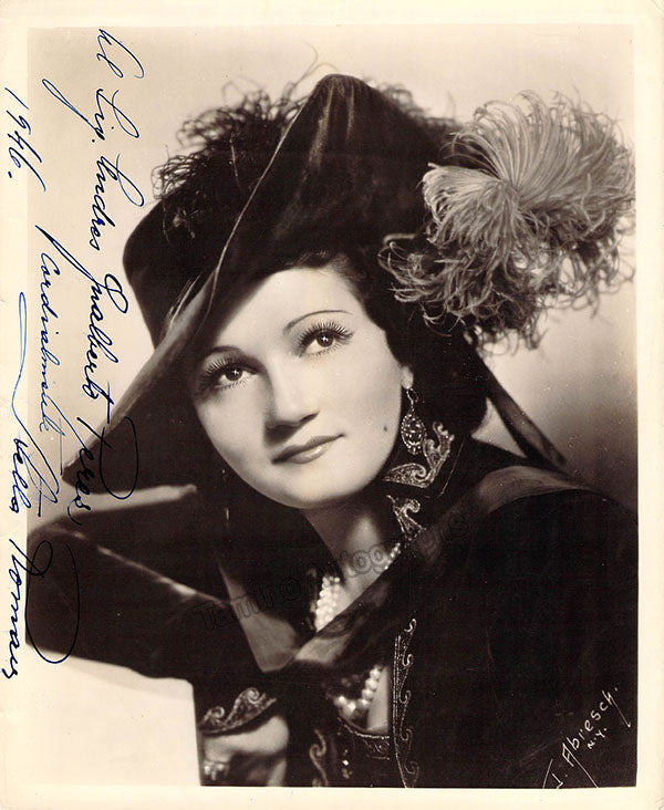 Romanian soprano (1904-1992), who sang mainly in Italy at the Rome Opera House and the United States in the Met Opera of New York. Signed photograph, shown in role, inscribed and dated in 1946.  Contains printed signature on front of photographer J. Abresch, New York. Size is 8 x 10 inches, small creases on edges of the photo, otherwise in very good condition.