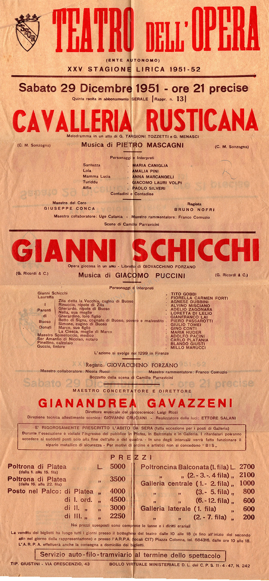 Beautiful playbill announcing the upcoming performance of Mascagni's "Cavalleria Rusticana" and Puccini's "Gianni Schicchi" at the Rome Opera on December 29, 1951, featuring Maria Caniglia, Tito Gobbi, Giacomo Lauri-Volpi, under the baton of Gianandrea Gavazzeni.