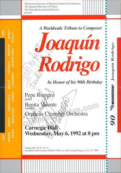 Signed promo ad, signed by both, Tribute to composer Joaquin Rodriguez, Carnegie Hall concert 1992, 7 x 9.25 inches
