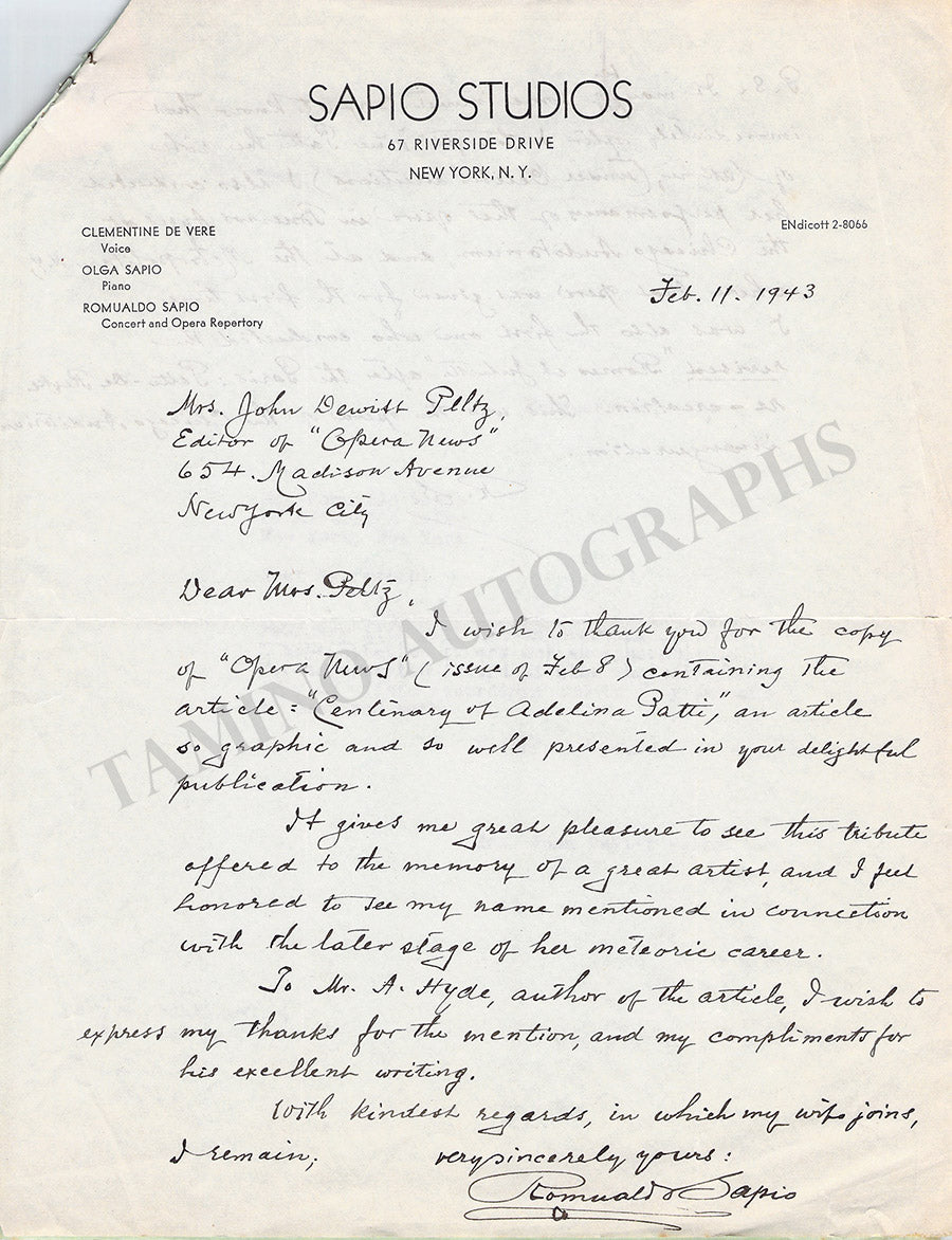 Autograph letter signed by him, dated 1943, addressed to the editor of the magazine Opera News about business.  Size is 8.3 x 10.8 inches, two written pages in one sheet, folds, in very good condition.