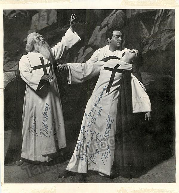 Signed half-tone photo, shown as Leonora in Verdi´s opera "La Forza del Destino", her debut role at the Met Opera when she was just 21 years old - Picture shows her with Enrico Caruso and José Mardones, a famous photo signed by the opera diva.