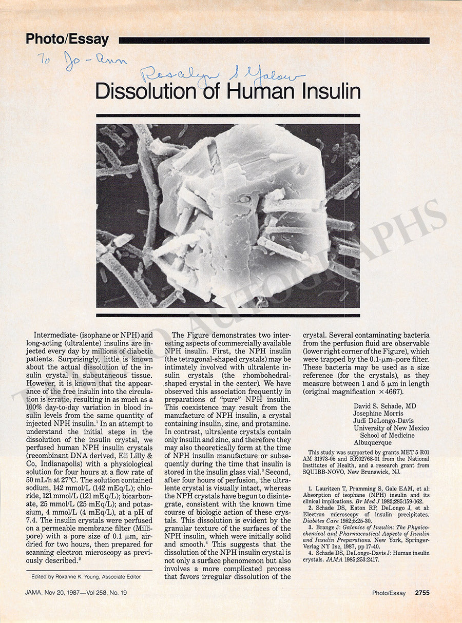 Page from her article Dissolution of Human Insulin published in 1987 signed and inscribed by her. Size is 7.8 x 10.7 inches, in very good condition.