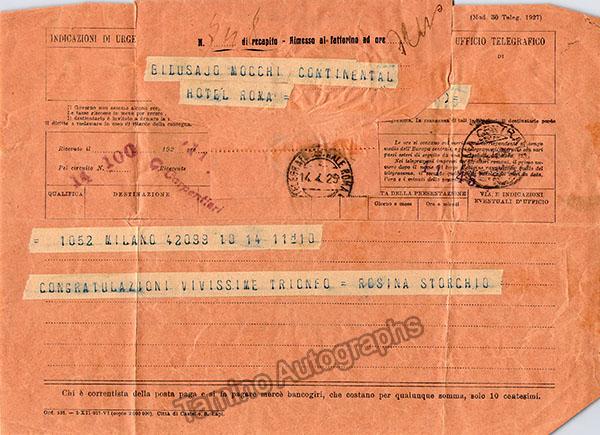 Storchio, Rosina - Telegram to Bidu Sayao 1929