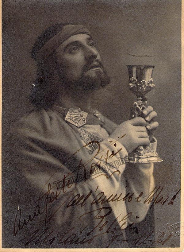 Italian baritone (1883-1933), signed photo, shown as Amfortas in Wagner's Parsifal, inscribed and dated in 1921. Blind stamped by photographer Venneta, Padova. Size is 5 x 6.75 inches, in excellent condition.