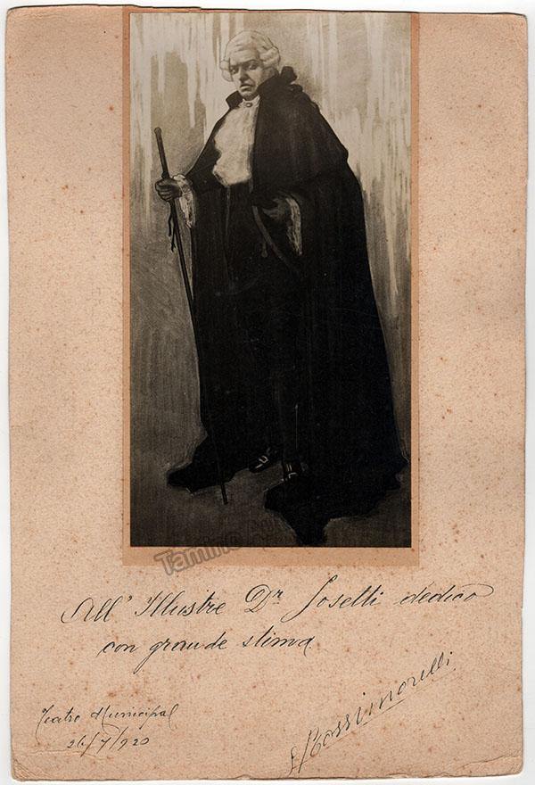 Italian baritone (1887-1940).  Larger size photo portrait mounted on a mat, shown as Vittelio Scarpia in Puccini's Tosca, signed, inscribed and dated by him in Rio de Janeiro, 1920.  Total size is 9.5 x 14.5 inches, actual photo portrait is 5.25 x 10 inches, spotted rust, minor creases, in good condition.