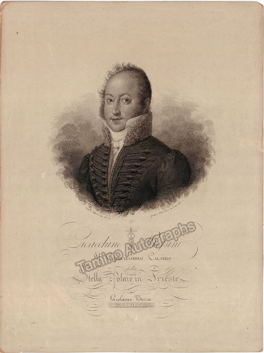 Large size engraving showing a younger opera composer Gioacchino Rossini (1797-1865), by Girolamo Bozza, 1827. This is an original engraving from Rossini's time, size is 13.4 x 17.5 inches, minor overall, uniform toning, in excellent condition.