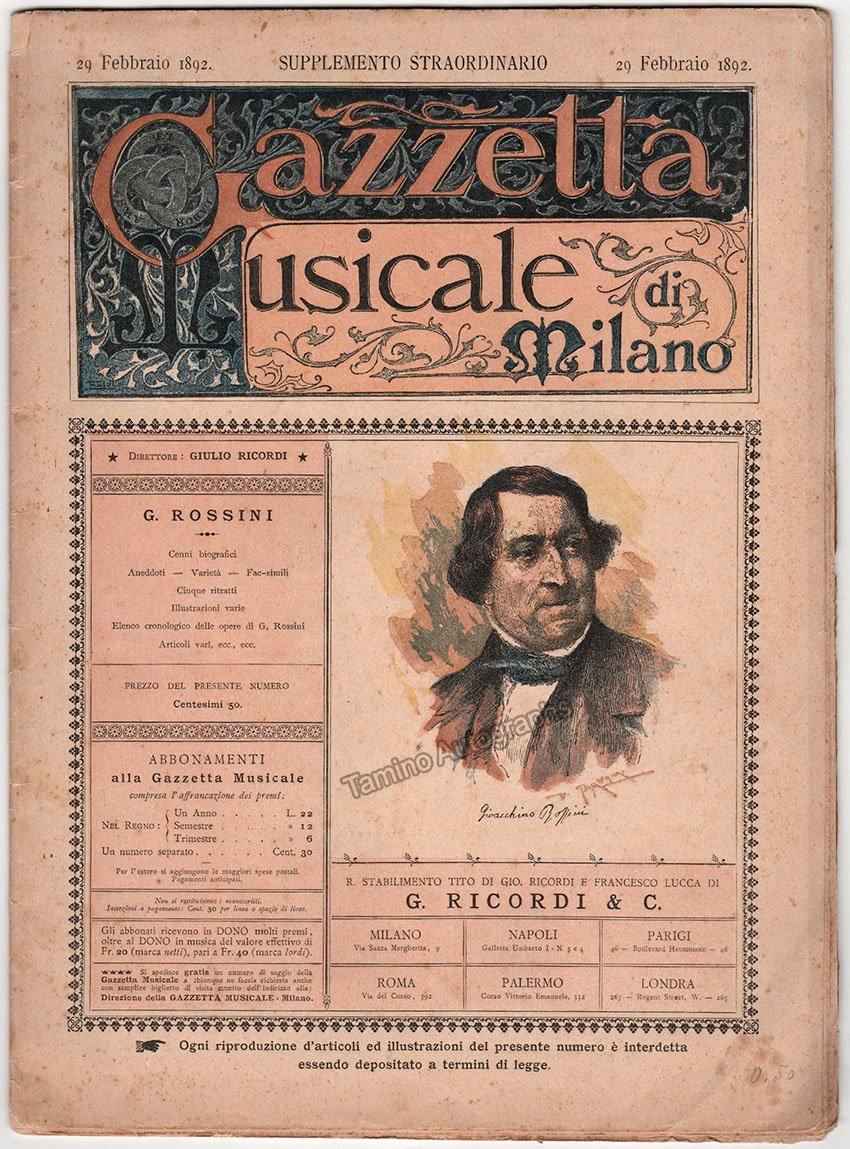 Special Italian issue of Gazzetta Musicale di Milano on February 29th, 1892, celebrating the Italian composer Gioacchino Rossini with a reproduction of his letters, illustrations, and articles about his life and career.  Size is 9.5 x 13 inches, full magazine with all pages and covers, minor rust stains, otherwise in excellent condition.