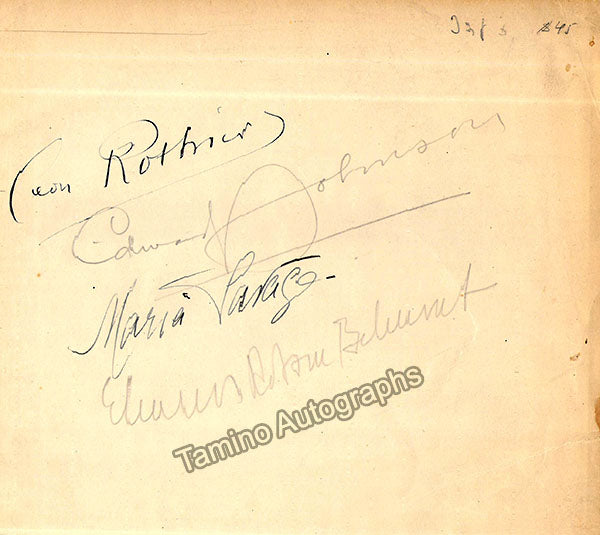 Signed album page containing multiple signatures - those of the French bass Leon Rothier (1874-1951), Canadian tenor and Metropolitan Opera General Manager Edward Johnson (1878-1959), Belgian-born American mezzo Maria Savage (1865-1957), and the English actress Eleanor Robson Belmont (1879-1979), a prominent philanthropist in the United States, particularly well-known for being the first woman on the board of directors of the Metropolitan Opera Association and for her founding of the Metropolitan Opera Guild. Size is 7.75 x 8.5 inches, small crease on bottom right, otherwise in very good condition.