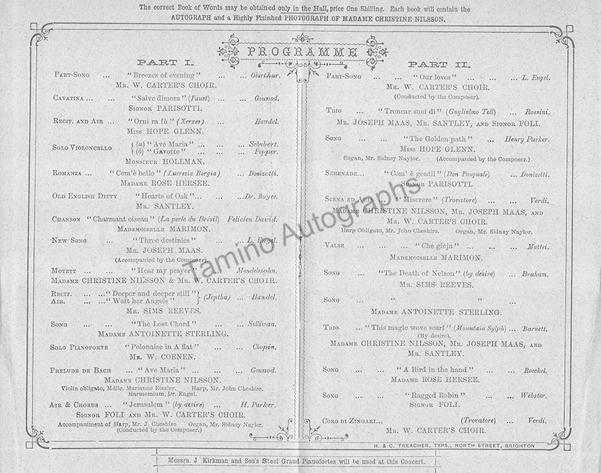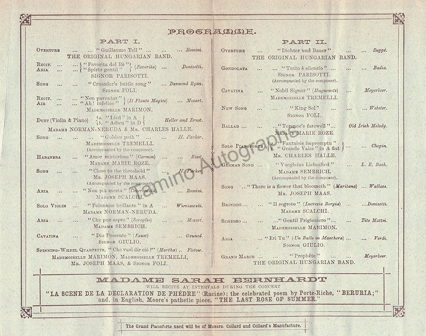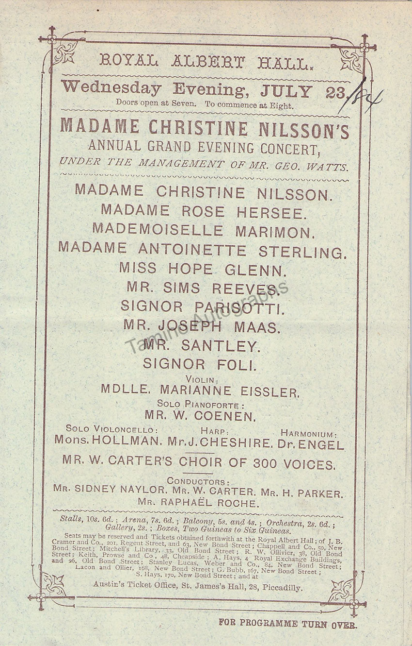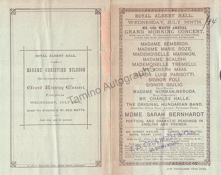 Set of 2 small programs for concerts at Royal Albert Hall, 1884, with important artists, including Christine Nilsson, Marcella Sembrich, violinist Wilma Neruda, actress Sarah Bernhardt and others.