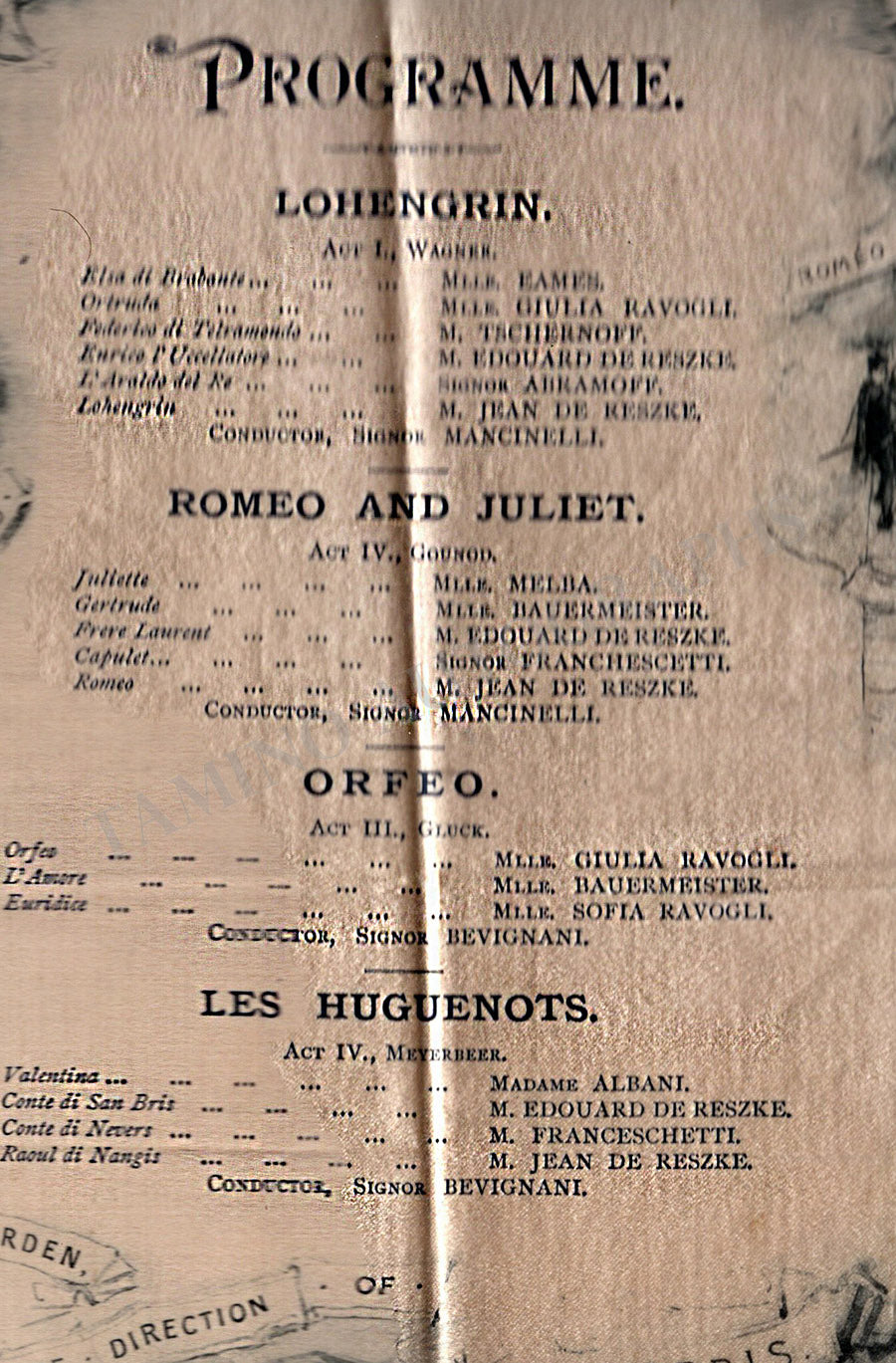 Performance included 1 act from each Lohengrin, Romeo et Juliette, Orfeo and Les Huguenots, with some very famous singers including Melba, Emma Eames, the De Reszke Brothers (Jean and Edouard), Albani, Bauermeister and the Ravogli sisters (Giulia and Sofia).